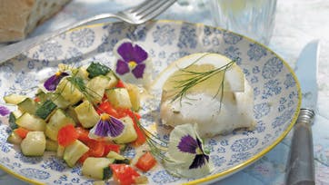 Læg fisken i et ovnfast fad, drys den med salt og peber, dryp lidt olivenolie over. Sæt fadet i ovnen ved 210° i 8 min. Skær courgetter og peberfrugter i mindre stykker. Hak løg og hvidløg. Kom lidt olie i en stegepande eller wok og brun courgetterne ved høj varme. Sænk varmen og kom peberfrugter, løg og hvidløg på. Steg, til det hele er let brunet. Smag til med salt og peber. Drys med blomster og server med nye kogte kartofler og evt. en klat smør til.