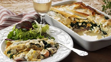 Overhæld fisken med kogende vand. Efter 5 min. deles fiskekødet i mindre stykker, der blandes med skaldyrene, salt og peber og hytteost. Spinaten dampes og vendes med feta, muskat og æg. Fillopladerne lægges i 3 lag og pensles med smeltet smør. Så lægges spinatlaget på, der lægges mere fillo på og sluttes med fiskelaget og et låg af penslet fillo. Bages ved 200° i 25 min.