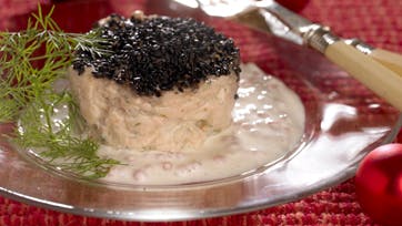 Bland cremefraiche med rogn og smag til med salt og peber. Vend postejerne ud og server med saucen.