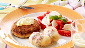 Steg bøfferne ved middelhøj varme i 5-6 min. på hver side, til de er gyldne og gennemstegte. Pil den afkølede peberfrugt fri for skind og kerner og blend den med dild og cremefraiche og smag til med salt og peber.