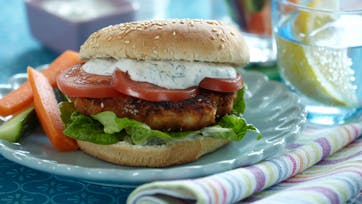 Hak sejfileterne og bland dem med æg, mel, krebsehaler, citronsaft, salt og peber til en fast fars. Form farsen til 4 bøffer og vend dem i rasp. Steg fiskebøfferne i olie 6 min. på hver side, til de er gyldne og gennemstegte. Rør cremefraichen med klippet dild, sennep og finthakket saltsyltet citron. Lun bollerne, halvér dem og fyld dem med salat i strimler, tomatskiver, en fiskebøf og dressing. Servér burgerne med grønsagsstave.