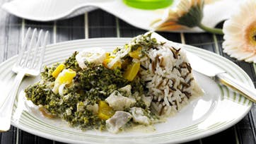 Skær fiskefileten i 1 cm store tern, kog grønkålen i letsaltet vand i 8 min. og lad den dryppe godt af. Skær peberfrugterne i tern og porrerne i ringe og læg dem i bunden af et ovnfast fad. Rør fløde, mælk, sennep, sennepspulver, salt og peber sammen, hak grønkålen fint og bland den i. Fordel fisken over grønsagerne og hæld grønkålsblandingen over. Stil fadet i en 200° varm ovn i 25 min. og server med kogte ris.