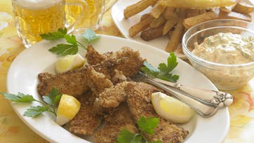 Kartoflerne skæres i stave. Koges i 1 min. og duppes helt tørre. Lav så fileterne, indtil de skal i ovnen. Vend fileterne i æg og dernæst i rasp med salt og peber. Steg dem i smør på en god, stor pande på begge sider, til de er lysebrune. Læg dem på en bageplade og giv dem samlet 5 min. ved 200° i ovnen til sidst, så alle får varme fileter. Urteremouladen røres sammen og smages til med krydderier. Stilles koldt, til det skal bruges og kan holde sig 4-5 dage. Varm olien, en kartoffels overflade er brun på 1 min. Kom halvdelen af kartoflerne i og steg dem i 4-5 min., til de er brune. Læg på køkkenrulle og drys med salt. Steg resten.