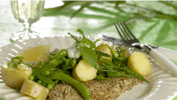 Kog kartoflerne 20 min. i letsaltet vand. Vend filterne i æg og så i sesamfrø med salt og peber. Steg dem gyldne i smør og olie. Bælg ærterne og snit sukkerærterne på langs til strimler, der vendes med ærtene og til sidste lige slynges i smørolie fra fisken. Drys med forårsløg i tynde skiver. Rør yoghurt med mynte, salt og peber og server til sammen med de nykogte kartofler og citronbåde.
