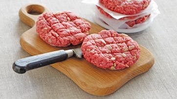 Læg bagepapir på en lille bakke eller et skærebræt. Del kødet i 8-9 portioner og form dem til flade, runde bøffer. Tryk et rudemønster på begge sider med bagsiden af en kniv, så bøfferne ikke danner skåle, når de skal steges. Læg de formede bøffer på bagepapiret. Stil bakken i fryseren. Lad bøfferne fryse helt igennem på 3-4 timer. Hvis det kniber med pladsen, kan de lægges to og to med bagepapir imellem. Når de er helt frosne, kan de lægges i plastposer. Tag så mange ud, som der skal bruges, og tø dem op på tallerken i køleskabet inden stegning.