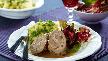 Bred kødskiverne ud på et bræt. Bland det hakkede kød med ost, appelsin, bær, salt og peber. Smør fyldet på skiverne, drys salt på og rul dem sammen. Bind med kødsnor eller hold rullerne sammen med kødpinde. Brun dem godt på alle sider i smørret. Dæmp varmen og tilsæt vand, appelsinsaft og rosmarin. Lad dem simre 15-20 min. under låg, de skal kun lige være gennemstegte, ellers bliver de tørre. Tag ruller og rosmarin op. Kog skyen lidt ind og kom fløde i. Smag til med salt og peber. Retten kan fryses ned.