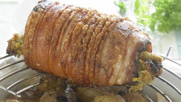 Rids sværen på den lange led og kog kartoflerne i letsaltet vand i 10 min. Hak persille, løg og chili fint og skær abrikoserne i små tern. Skær franskbrødet i tern og lad dem udbløde i fløden. Bland persille, løg, chili og abrikos med brødet og fordel det på svinebrystets kødside. Rul brystet sammen om fyldet, bind til med kødsnor og gnid sværen med salt. Del hvidløget i fed og kom dem sammen med kartoflerne i en bradepande. Ryst bradepanden, så kartoffelskrællen brister, kom olie og salt over kartoflerne og stil dem i ovnen ved 160°. Læg svinebrystet på en rist og sæt det ind over kartoflerne i 1½ time. Tag kartoflerne ud og grill sværen så den bliver sprød.