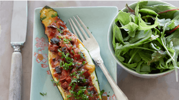 Halvér courgetterne og fjern kernerne. Krydr courgetterne med salt og peber, læg dem med skærefladen nedad og bag dem ved 175° i 15 min. Hak løg og oliven og skær pølsen i små tern. Svits løg og pølsetern i olien og befri tomaterne for kerner. Skær tomaterne i små tern og bland dem med pølser, oliven, hakket basilikum og revet mozzarella. Vend courgetterne, kom fyldet i og giv dem yderligere 15 min. ved 200°. Servér med en god salat.