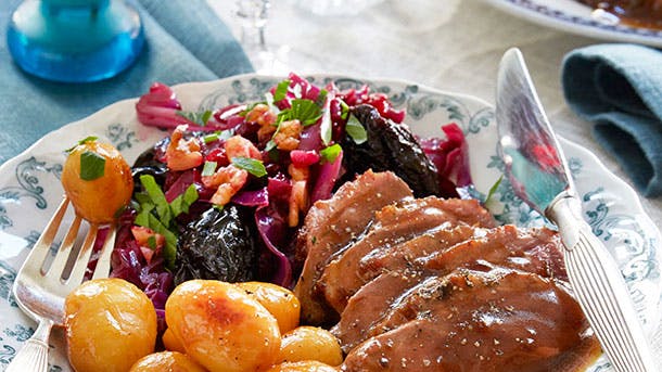 Mmm... Skønne, honningristede kartofler, en rødkål med svesker og valnødder og - sidst men ikke mindst - et velsmagende gåsebryst med tilhørende sauce. Velbekomme.