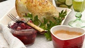 Gammeldags kylling med rabarberkompot og agurkesalat