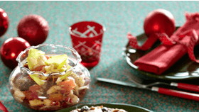 Skær eller klip fignerne i strimler, pres den ene appelsin og lad fignerne trække et par timer i appelsinsaften. Skær granatæblet over og skrab kernerne ud med en teske, undgå de hvide hinder. Snit julesalaten, skær skallen af den anden appelsin og skær kødet i tern. Skær æblerne i tern. Bland det hele i en skål. Pisk dressingen sammen, hæld den over og bland det godt.