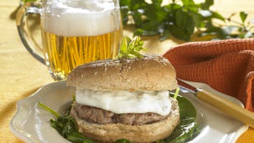 Bland kød, løg, oregano, salt og peber og form det til 4 burgere. Steg dem på pande i olie 2-3 min. på hver side. Varm bollerne 2-3 min. i ovnen eller på brødrister. Skyl spinaten og lad den dryppe af. Smid den på en stor, varm pande sammen med 1 spsk. olivenolie, og lad den stå, til den begynder at falde sammen. Krydr med salt, peber og muskat. Flæk bollerne og læg en burger og tzatziki i hver. Læg en bund af spinat på tallerknerne og burgeren ovenpå.