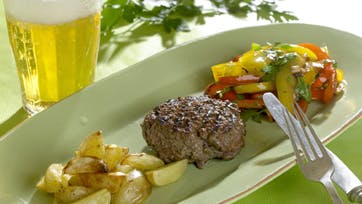 Begynd med peberfrugterne der udkernes og skæres i strimler og steges i olie, til de er bløde. Løg og hvidløg hakkes og kommes ved, og det hele småsimrer i 20 min. Smages til med salt og peber. Kartoflerne skrubbes og skæres i både, der bages drysset med salt og lidt olie spredt ud på bagepapir i ovnen ved 200° i 20-25 min. Citronerne skrælles tyndt og skrællen skæres i strimler, der vendes med salt. Lidt af citronsaltet nulres over bøfferne og steges på grillpande 6-8 min. på hver side. Serveres med peperonata der vendes med grofthakket persille til sidst samt de ovnstegte kartofler.