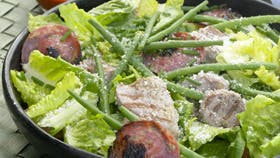 Skær mørbraden i 2 cm tykke skiver og tryk dem flade. Giv skiverne salt og peber og læg dem i plastpose med olien. Nip bønnerne og kog dem 2 min. i letsaltet vand. Skyl og snit salaten. Bland salat, bønner, purløg og grana. Steg salamiskiverne sprøde på pande og læg dem på fedtsugende papir. Grill mørbradskiverne 2-3 min. på hver side. Læg skiverne på salaten. Pynt med salami og dryp lidt olie og balsamico over. Server med ajvarsauce og brød lunet på grillen.