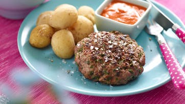 Vask kartoflerne og kog dem i 3 dl vand sammen med saltet i 15 min. uden låg. Bland oksekødet med krydderurter og form det til bøffer. Blend hvidløg, rød peber, spidskommen, paprika og salt med lidt af olien til en fin pasta. Tilsæt resten af olien lidt ad gangen, mens der blendes, til sovsen er glat og cremet. Grill bøfferne i 5 min. på hver side, til de er netop gennemstegte, og server med en god salat.