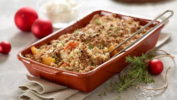 Dej: Bland de to slags mel med nødder og lidt salt og smuldr smørret i. Smuldr dejen over grønsagerne og sæt fadet i ovnen ved 200° ca. ½ time, til overfladen er gylden og sprød.