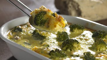 Skær stilkene af broccolien, skræl dem og snit dem fint. Del buketterne i lidt mindre stykker. Flæk courgetten, fjern kernerne og skær den i små stykker. Svits gulerødder, porrer, broccolistænger og courgette i smør sammen med 1 tsk. salt på en stor pande og hæld det i et ovnfast fad. Pisk æg, cremefraiche, majsstivelse, salt, peber og timian sammen og hæld det over grønsagerne. Drys med revet ost og stik broccolibuketterne ned. Bages ved 175° i 50-55 min. på nederste rille. Lad fadet stå 5 min., inden der tages hul på det.