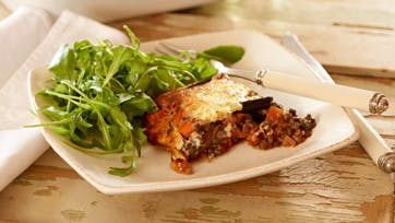 Skær auberginerne i skiver på langs. Drys auberginerne med salt og lad dem trække i 20 min. Børst saltet af og pensl med olivenolie. Bag dem i ovnen ved 220° i 15-20 min., til de er møre og let brune. Kog linserne i bouillon i ca. 15 min., til de er møre. Hæld vandet fra. Steg løg og hvidløg i olie. Kom gulerødder, kanel og tomater ved og lad det simre i 10 min. Tilsæt linserne, kog op med persille og smag til. Læg lag af aubergine med linsesovsen og hæld en blanding af æg, mælk og ost med lidt salt og peber over. Stilles i ovnen ved 180° i 50 min. Hvis musakaen skal fryses, skal det gøres, inden den har været i ovnen. Server med grøn salat og groft brød.