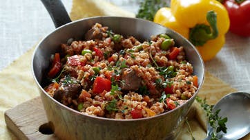 Skær kødet i passende tern. Brun kødet i en stor gryde i olien, til det har fået farve. Pil og hak løg og hvidløg og lad det stege med. Tag kødet op, når det begynder at brune. Tilsæt perlespelten og lad den stege i 1 min. Kom de flåede tomater ved og lad det koge under låg i 10 min. Kom kødet tilbage i gryden og kog retten videre i 10 min. Rens peberfrugterne, skær dem i tern og lad dem koge med i 3-4 min. Smag på spelten, om den er mør. Smag retten til med salt og peber og kom timianblade og edamame bønner i lige inden servering.