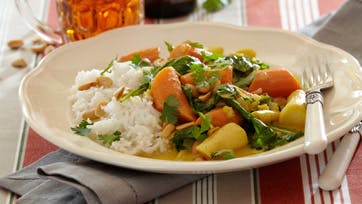 Skræl rødderne, skær dem i store, grove stykker og vend dem grundigt med olie, kanel, koriander, salt og peber. Sæt dem i ovnen ved 180° i 20 min. Snit og hak citrongræs, løg og de andre krydderier og steg dem i olie ved lav varme og tilsæt gurkemeje. Lad det simre i olien i 10 min. Vend rødderne i sammen med juice og kokosmælk og giv dem et opkog. Tjek om rødderne er møre, som du vil have dem. Sluk og vend spinaten i. Server med de hakkede koriander, jordnødder og kogte ris til.
