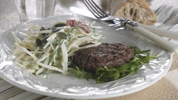 Form to bøffer og steg dem med salt og peber på slip let-pande. Skræl sellerien og skær den i meget tynde "tændstikker" (julienne - eller riv den på et rivejern). Vend den straks i yoghurt rørt med salt, peber og sennep. Skær renset blegselleri i små måner og vend dem i salaten sammen med grofthakkede soltørrede tomater og halvdelen af den skyllede rucola. Ved servering lægges resten af rucolaen som bund, og der drysses med græskarkerner og serveres brød til.
