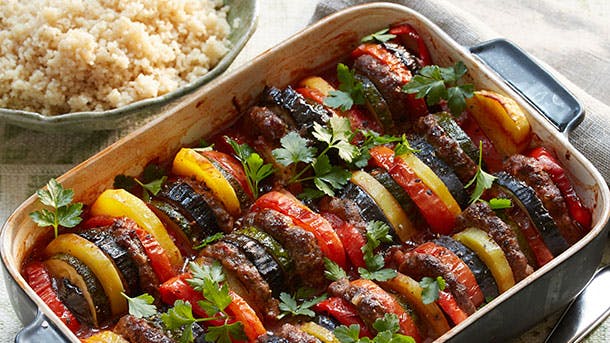 De klassiske hakkebøffer er blevet peppet lidt op og serveres her side om side i et fad med grøntsager. Servér med couscous eller bulgur.