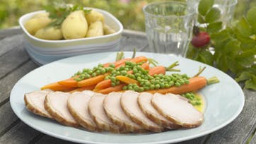 Kog hamburgerryggen ca. 1 time i vand. Kasser vandet og lad den sætte sig. Bælg ærterner og skrab eller skræl gulerødderne. Kog kartoflerne og anret i skål med smørsovs til. Kom gulerødderne i en gryde med 2 cm vand i bunden og en klat smør. Læg låg på og damp 3-4 min., tilsæt ærter og damp i 2-3 min. mere, mens du slynger smørvandet rundt om dem. Server til skiver af hamburgerryg og husk også en god sennep.