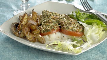 Lav en pakke med bagepapir, der smøres med olie. Læg fiskestykker på og drys med salt og peber. Skær skiver af tomat og læg på begge stykker og dryp med olie. Luk pakken og stil 4 min. i ovnen ved 210°. Tag ud og åbn pakken. Rør ost, sennep og purløg sammen og hæld på tomaten. Stil i ovnen ved 250° uden at lukke pakken i 5-7 min., til osten bobler. Server med kartoffelbåde og salatblade.