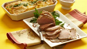 Gnid kødet med salt og peber. Vikl baconskiverne om og hold dem fast med kødsnor. Varm smørret i en gryde og brun kødet godt på alle sider. Drys mel over og hæld bouillon ved. Bring det i kog, læg låg på gryden og lad kødet simre mørt på ca. 30 min., til et kødtermometer viser 66-68°. Tag kødet op og pak det i folie, mens saucen laves. Hæld fløden i gryden og kog saucen ind et par min. Smag til med salt, peber og ribsgelé. Tag snoren af kødet og skær det i tynde skiver.