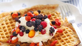 Steg vaflerne i vaffeljernet, men spar på dejen - vaflerne skal være meget tynde. Pynt med flødeskum og bær.