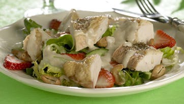 Steg kyllingen ca. 15 min. i ovn, hvis det er filet. Skyl salaterne og bland dem med ærter, spirer og agurk. Fordel på fad eller tallerkner. Drys med appelsinsaft, skivede jordbær og cashewnødder. Skær kyllingen i små stykker og top op. Rør dressing sammen af tahina, eddike, mælk, citron og chili og smag til med salt og peber. Hæld det over og drys med sesamfrø til sidst.