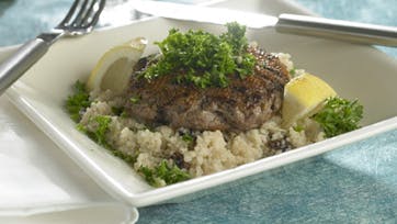 Kom couscous, mandler og rosiner i en skål og overhæld med kogende bouillon. Lad det trække i 10 min. Smør harissa på de formede bøffer, drys med salt og peber og steg dem på en grillpande, 4-5 min. på hver side. Anret couscous på to tallerkner og læg en bøf på toppen af hver af dem. Pynt med lidt persille og citronbåde.