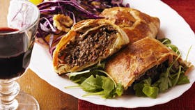 Hak nødder og svampe groft og bland med rosmarin, tomater, salt og peber og en æggehvide. Rul butterdejen ud til 4 firkanter og stik evt. en stjerne ud af resterne. Lav 4 fine pakker med fyld af dette og luk med æggehvide. Pensl med lidt æggeblomme og bag ved 200° i 25 min., til de er gyldne og faste. Steg løg i olivenolie, kom oliven ved og hæld appelsinsaft og evt. lidt revet skal ved. Rør fløden ud med majsstivelse, og når sovsen er kogt lidt ind, tilsættes jævningen. Smages til med salt og peber. Hertil kan man både nyde kartoflerne og rødkålssalaten.