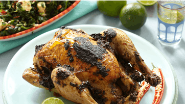 Kom soja, sukker, eddike, allehånde og olie i en skål. Skræl eller rens ingefæren, chili, timian, forårsløg, hvidløg og løg. Pres limefrugterne. Kom alle ingredienser til marinaden i en foodprocesser og blend til en grov masse. Gnid den på kyllingen, så den er dækket. Sæt kyllingen tildækket i køleskabet i 24 timer. Sæt kyllingen i ovnen ved 150° i 2½ time. Optø spinaten. Pil og hak løg, ingefær og hvidløg. Varm olien op i en gryde, kom løg, ingefær og hvidløg i og lad det stege et par min., inden spinaten kommes i sammen med spidskommen og chili. Kog det sammen og vend osten i. Smag til med salt og peber. Lad retten småkoge i 5 min., så osten smelter i kanten og jævner spinaten.
