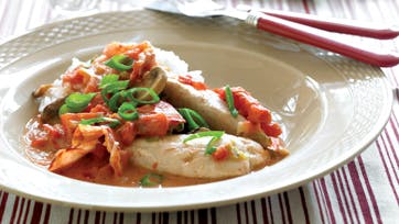 Bland madlavningsfløde, tomater og krydderier og hæld det over kyllingen. Sæt fadet i ovnen ved 200° i 30 min., drys med lidt friske krydderurter og server med ris og en lækker salat.