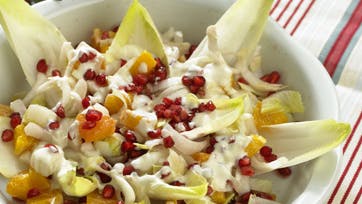 Skær rodenden af julesalaten og tag nogle pæne blade fra til pynt. Flæk julesalaten og skær den lille kegleformede stok forneden væk, den er lidt bitter. Snit salaten på tværs. Rul granatæblet under fast hånd på køkkenbordet, så kernerne løsner sig. Flæk æblet og skrab kernerne ud uden de små, hvide hinder. Skræl appelsinerne og skær dem i tern. Læg de hele julesalatblade i bunden af en skål og bland snittet salat, appelsin og granatæbler i skålen. Pisk marinaden sammen og smag til med sennep, sukker, salt og peber. Hæld marinaden over salaten kort tid inden serveringen.