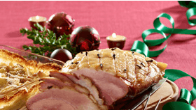 Skær sværen af skinken, men lad et tyndt lag fedt sidde, som du skærer i fine tern. Læg skinken i et ovnfast fad og drys med løg og nellike, der stikkes i fedtet over den. Fyld op med vand i ca. 3 cm højde. Pak stegen grundigt ind i alufolie i flere lag. Sæt den i 160° varm ovn i 1 time, sænk så temperaturen til 140° og fortsæt i 1½ time mere. Lad den så hvile, mens du laver glaseringen.