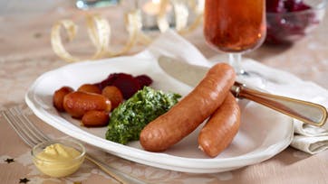 Kom kålpølserne i kogende vand, sluk for varmen og lad dem stå i gryden i 25 min. Skyl grønkålsbladene og kog dem i letsaltet vand i 8 min., hæld vandet fra og hak dem fint. Smelt smørret, rør melet i og tilsæt mælken under omrøring. Lad stuvningen koge et par min., tilsæt kålen, varm den igennem og smag til med salt og peber. Server med brunede kartofler, sennep og syltede rødbeder.