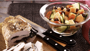 Skær kødet ud så det bliver til et stort, fladbanket rektangel. Smør olivenpuré på og læg skiver af mozzarella, strimler af tomater og hakkede krydderuter på. Rul stegen og snør den med kødsnor. Pensl med olie og gnid med salt og peber. Stil i ovnen ved 180° i 45 min. til den er gennemstegt. Server med melonsalat og flute.