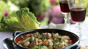 Sauce: Smelt smørret i en gryde, drys melet i og rør det sammen. Spæd med suppen lidt ad gangen under piskning. Lad det koge et par min. og tag det fra varmen. Pisk æggeblommer og fløde sammen. Pisk lidt af den varme sauce i og hæld det hele tilbage i gryden. Varm forsigtigt op uden at koge og smag saucen til med salt og peber. Vend kød og grønsager i saucen og pynt med hakket persille.
