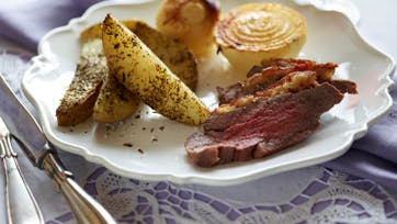 Rids cuvetten, læg den i et ovnfast fad og krydr med salt og peber. Pil løgene, halver de store og kom dem i et ovnfast fad. Rør fløden med eddike, timian, saft og skal fra appelsinen, hæld den over løgene og bag dem i ovnen ved 225° i 15 min. Dæmp ovntemperaturen til 200°, sæt cuvetten ind til løgene og steg videre i 45 min. Skær cuvetten i tynde skiver og server med kartoffelbåde.