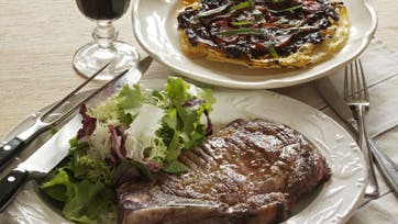 Når de er færdigstegte og tærten er klar, vendes den ud af formen, så tomaterne kommer opad, og der skæres skiver af tomattærte til koteletten, som også serveres med salat.
