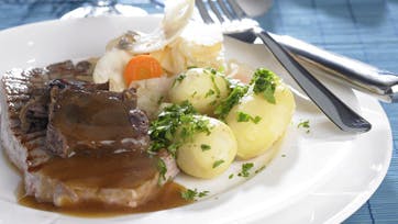 Svits løg og gulerod i en gryde i halvdelen af smørret og tag det op. Krydr skanken med salt og peber og brun den ca. 2 min. på hver side i resten af smørret. Tilsæt resten af tingene undtagen citronsaft og majsstivelse. Lad kødet koge mørt under låg i 1½-2 timer. Tag kødet op og lad det køle af. Si suppen og kog den ind til ca. 3 dl. Fjern ben og hinder fra kødet og del det i mindre stykker. Hertil kan forberedes. Skum fedt af saucen, varm den op og jævn med majsstivelse. Smag til med citronsaft, salt og peber. Varm kalveskanken i lidt af saucen. Krydr koteletterne med salt og peber og steg dem i smør 2-3 min. på hver side. Læg koteletterne på varme tallerkner med skank på toppen. Server med saucen, kartofler, kartoffelmos eller brød og grønsasgerne. Hertil skrælles gulerod, pastinak og glaskål og skæres i så tynde skiver som muligt. Skær rodskiven af fenniklen og skær den tyndt. Bland olie, rødvinseddike, salt og peber i en skål og vend grønsager og solsikkekerner i. Lad det trække 3 timer.