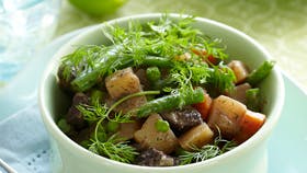 Svits løg og hvidløg i lidt olie, til de er klare. Tilsæt kødet sammen med paprikaen og brun det af. Hæld bouillon og rødvin ved kødet og lad det hele simre i 20 min. Skær kartoflerne i tern og gulerødderne i skiver. Kom kartofler, gulerødder og dild ned til kødet og lad det simre i yderligere 20 min. Tilsæt fløde, ærter og bønner og kog retten igennem. Smag retten til med salt og peber og servér den drysset med klippet frisk dild.