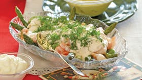 Sauce: Rør mayonnaise og cremefraiche sammen og smag saucen til med hummerfond, paprika, salt og peber. Læg asparges og skaldyr i top på et fad og hæld saucen over. Pynt med dild.