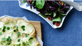 Skræl kartoflen og skær den i papirtynde skiver, brug f.eks. et mandolinjern. Vend kartoffelskiverne i hvidløgsolien. Skær mozzarellaost i skiver og fordel dem på pizzabundene.