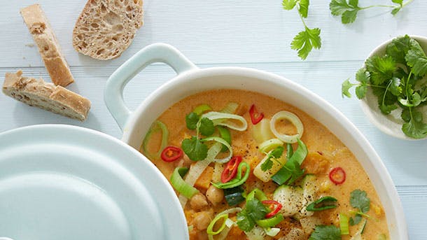 Vegetarretter behøver bestemt ikke at være kedelige - se nu bare denne kikærtegryde, der smager skønt med ingredienser som karrypasta, chili og butternutsquash.