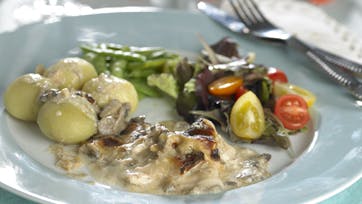 - Det er en nem ret, der kan laves klar i forvejen og blot varmes igennem, lige før gæsterne sætter sig til bords. Jeg har erstattet piskefløde med fløde 9%, for det giver en mindre tung sovs, siger Kristina.