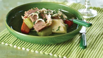 Kog kødet med et par kraftben til en kraftig suppe. Spis den en rigtig kold dag med kød-og melboller og suppeurter.