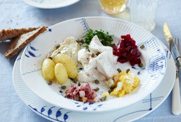 Drys torskefileterne med lidt salt. Bring vand i kog, tilsæt 1 tsk. salt pr. l. Læg torsken i og sluk. Lad torsken trække i kogevandet i 8-12 min. afhængigt af størrelsen. Si lagen. Afbag smør med mel og spæd med kogevand. Smages til med sennep og rundes med fløde, salt og peber. Server torsken med diverse tilbehør.